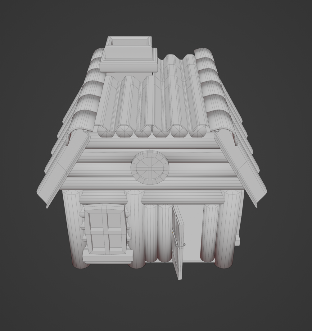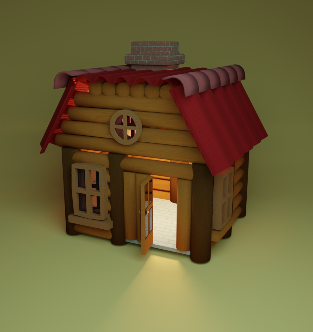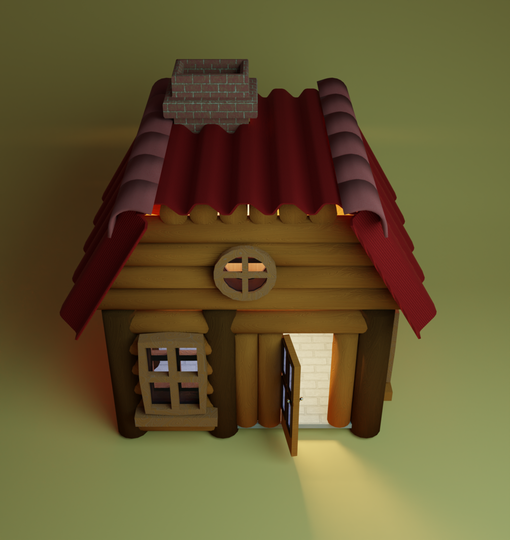 Modelo tipo Cabaña realizado en blender 3.6, Todos los elementos que componen la cabaña están separados como objetos independientes sin subordinación a excepción de la puerta que tiene como subordinados las bisagras. Los materiales y texturas son de tipo procedural realizadas con nodos,
