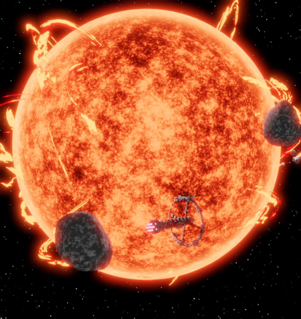 La escena tipo película está diseñada e inspirada en el espacio, todos los objetos cuentan con animaciones individuales y personalizables. Para modificar algunos aspectos de la escena se utilizaron controladores básicos, estos controladores los encontrarás presentes en los propulsores de la nave y los aros de fuego del sol. Todas las texturas son procedurales, con respecto a las texturas del sol y los aros de fuego cuentan con comando de animación: # frame *.001. Este comando se utiliza para crear una alteración constante en las texturas a lo largo de los frames.