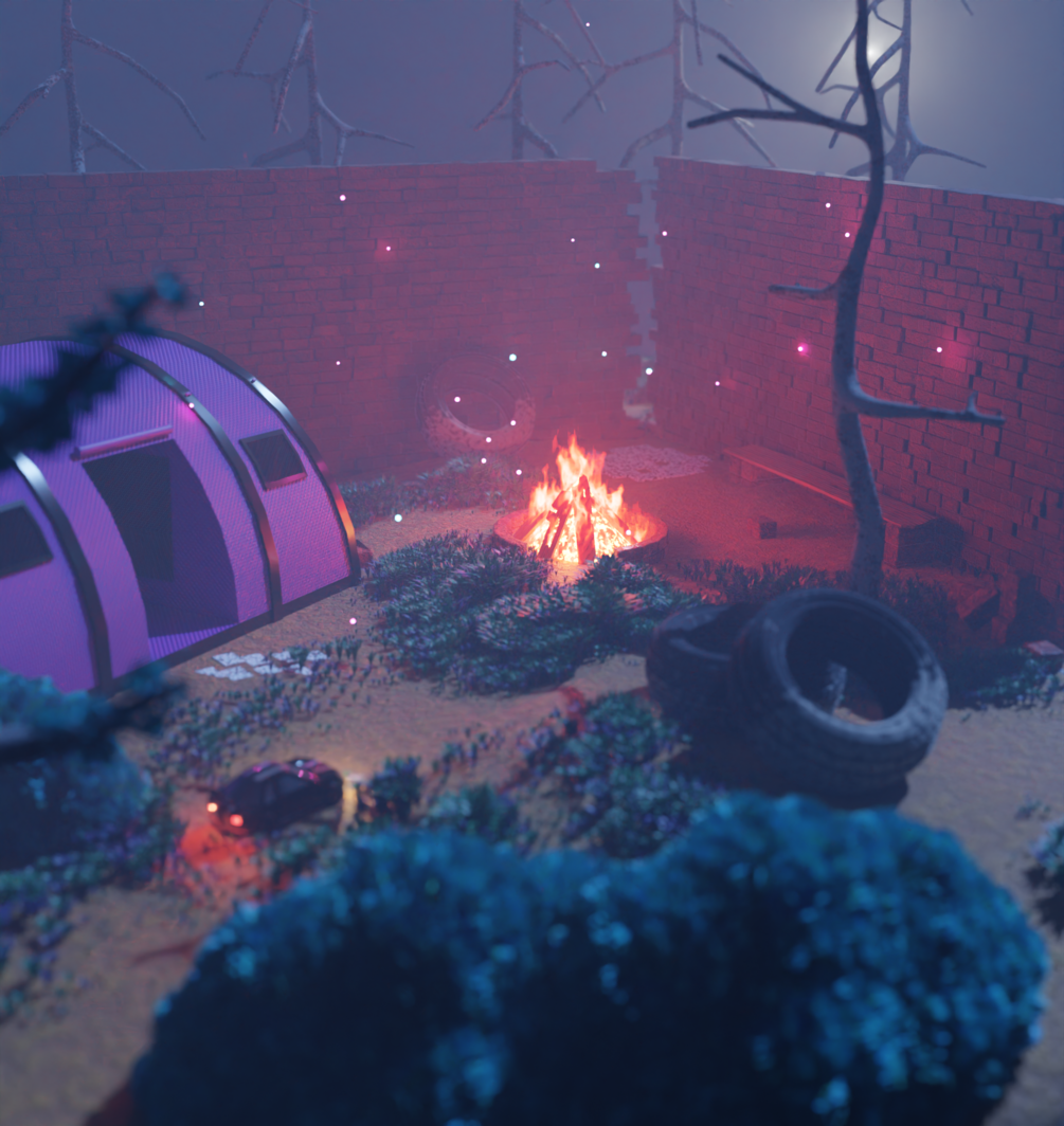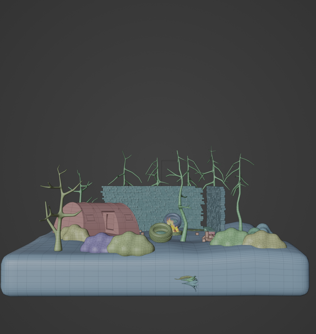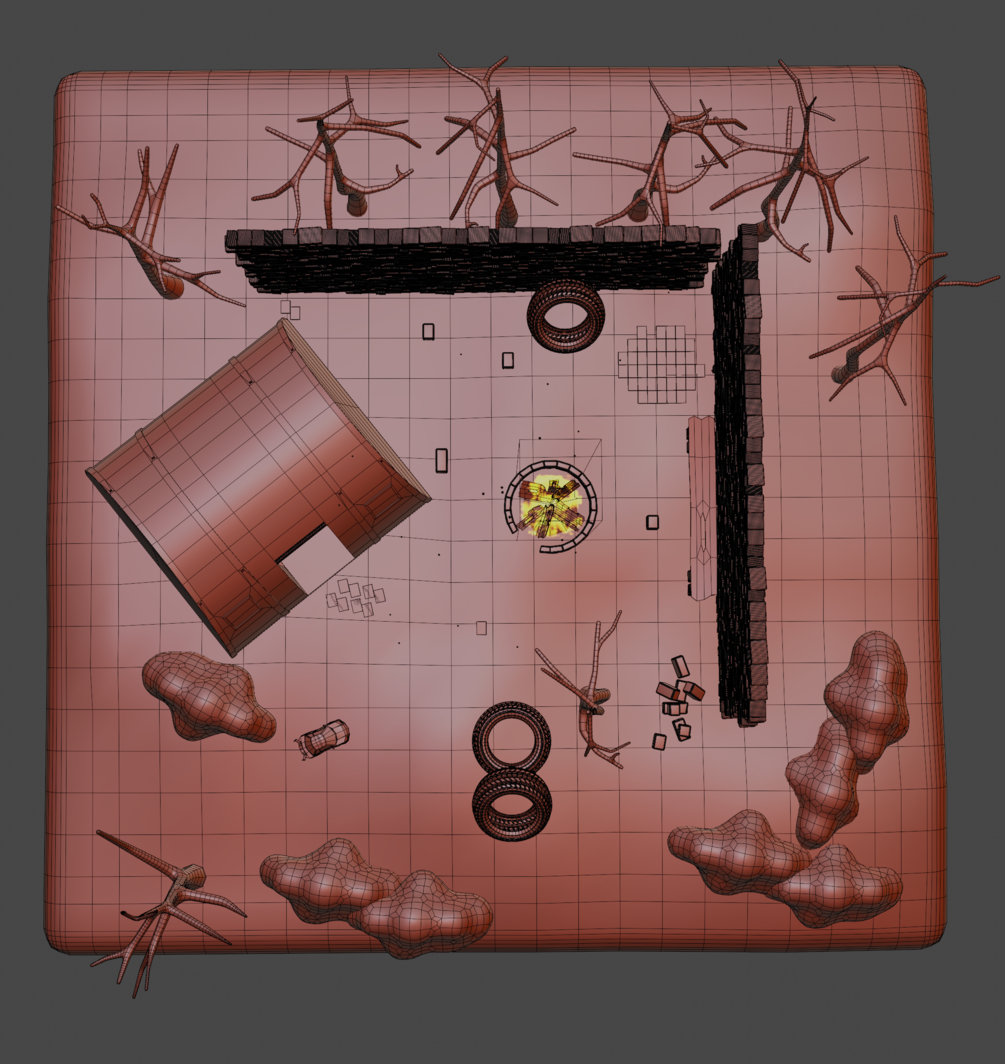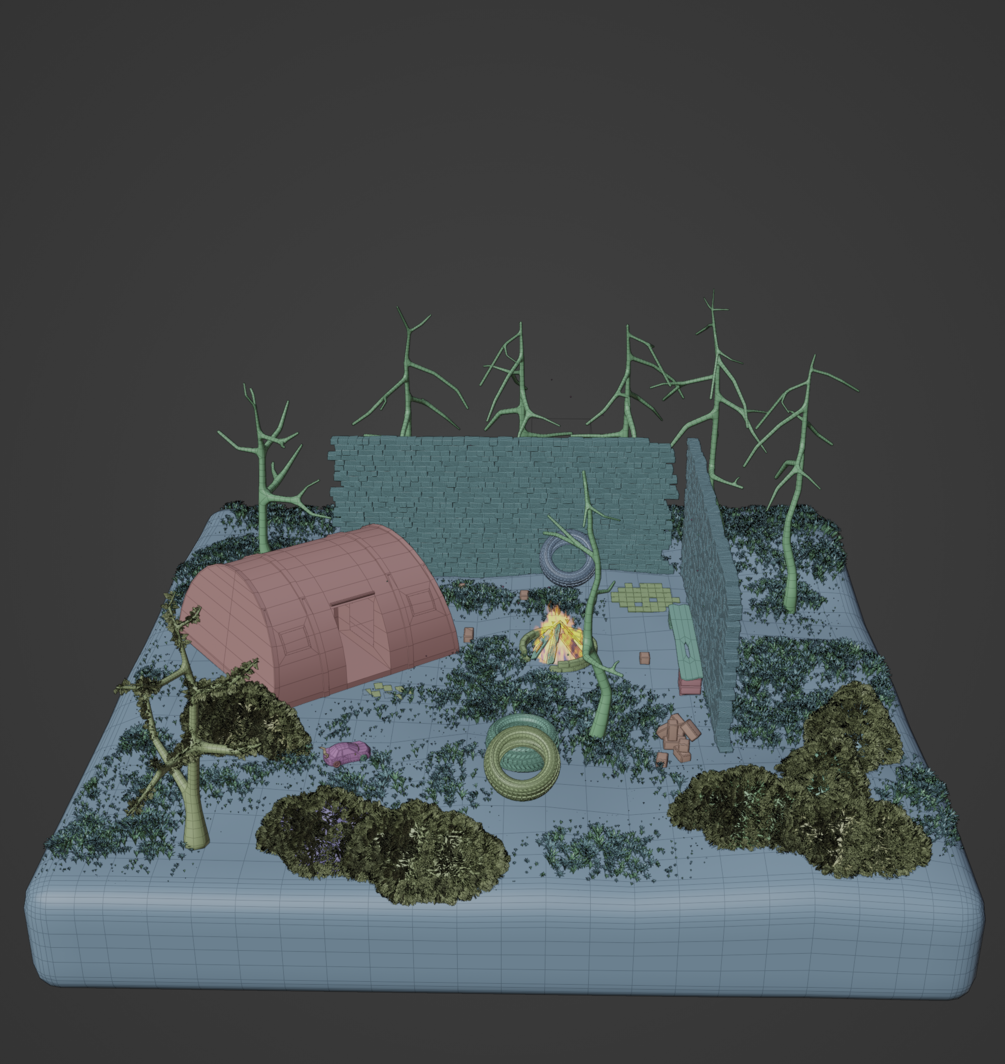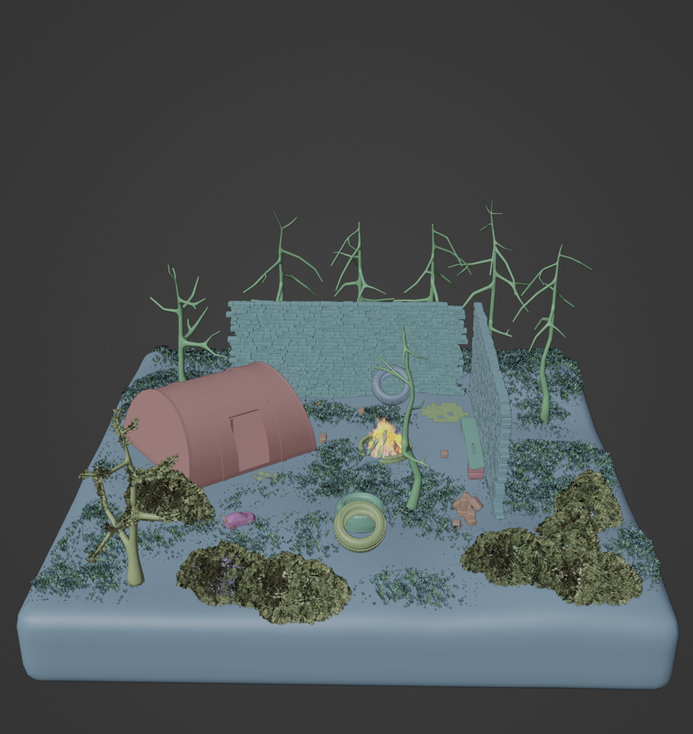 Modelo tipo diorama realizado en blender 3.6. La mayoría de los elementos que conforman la escena fueron realizados con técnicas de modelado poligonal no procedural, por supuesto hay excepciones, en el caso de los muros de ladrillo la técnica es diferente, ya que son objetos procedurales puedes modificar los parámetros de medida tanto del muro en general como de los ladrillos individuales, Dentro de las modificaciones permitidas tenemos el cambio de longitud, grosor del muro, aleatoriedad de tamaño de ladrillo a ladrillo, Profundidad, Cantidad de ladrillos etc.
